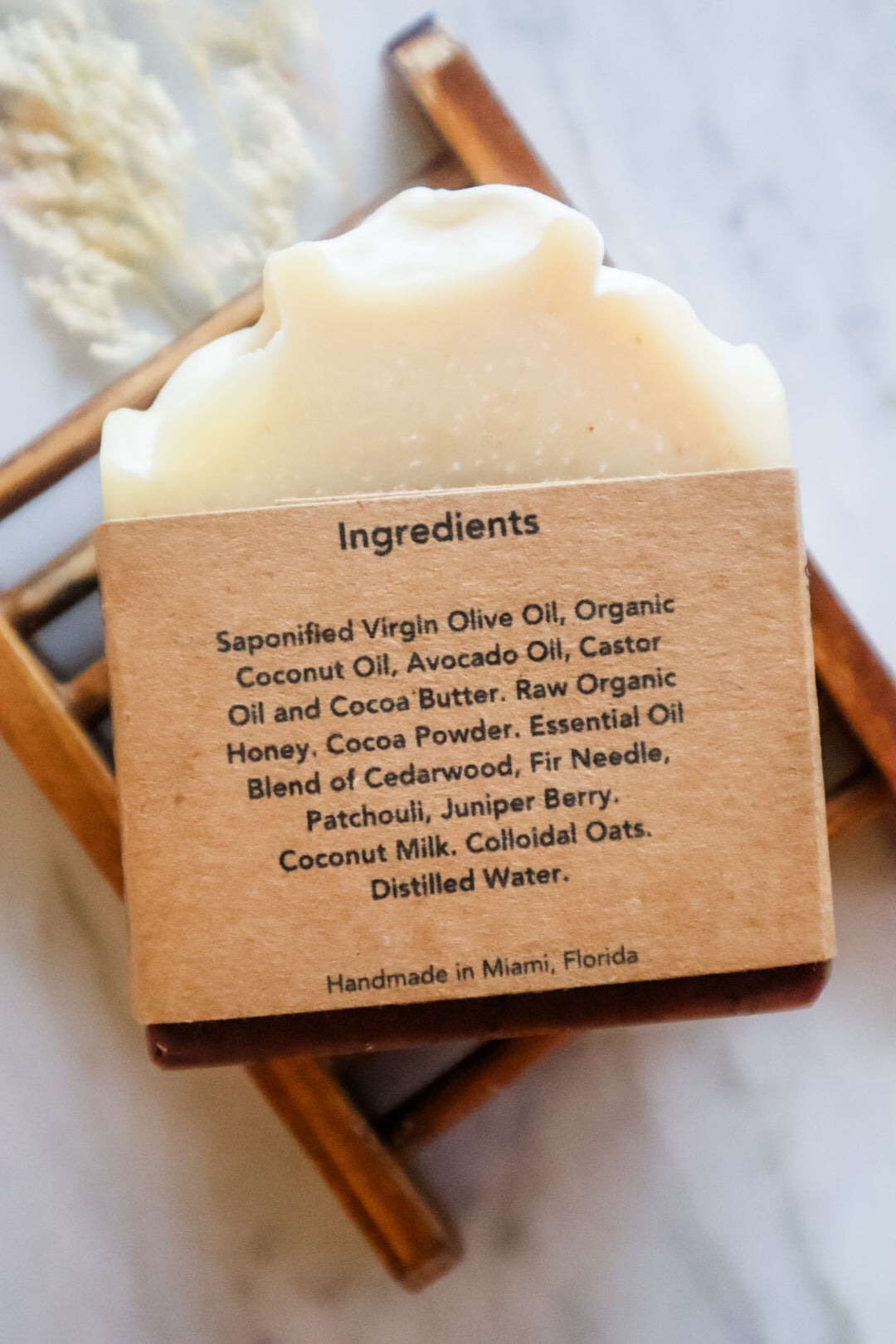 Saponified Virgin Olive Oil, Organic Coconut Oil, Avocado Oil, Castor Oil, Cocoa Butter, Coconut Milk, Organic Raw Honey, Cocoa Powder, Colloidal Oatmeal, Cedarwood Atlas Essential Oil, Fir Needle Essential Oil, Patchouli Essential Oil, Juniper Berry Essential Oil. Distilled Water, Sodium Hydroxide**
